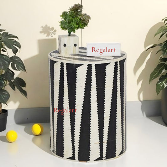 Bone Inlay Side Table & End Table, Black Round Bone Inlay Stool with Electric Pattern - Unique Home Decor Furniture
