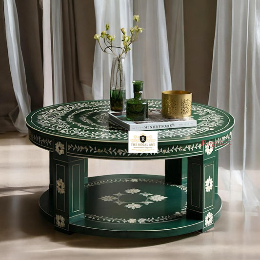 Round Bone Inlay Coffee table | Floral Bone Inlay Double shelf Coffee table | Green Floral Design Bone Inlay Coffee table