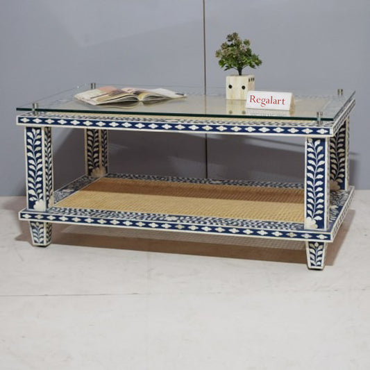 Handcrafted Double Shelf Bone Inlay Floral Coffee Table