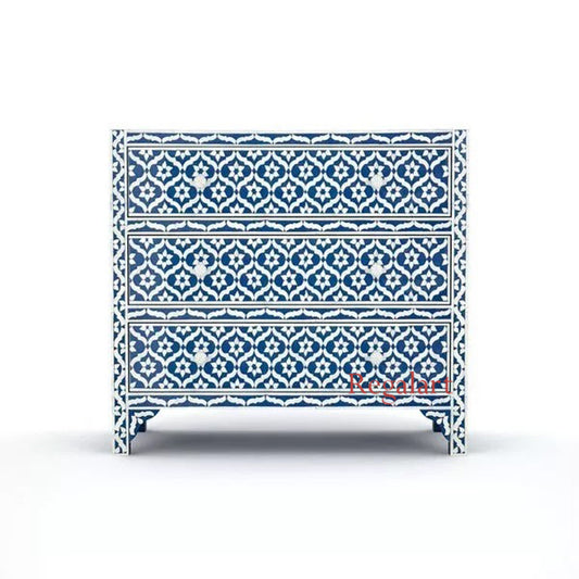 Bone Inlay Chest of Drawers Floral Blossom Indigo Finish | 3-Drawer Luxury Dresser | Elegant Home Storage Furniture