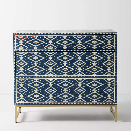 Three Drawer Bone Inlay Chest | Geometric Pattern Dresser for Home