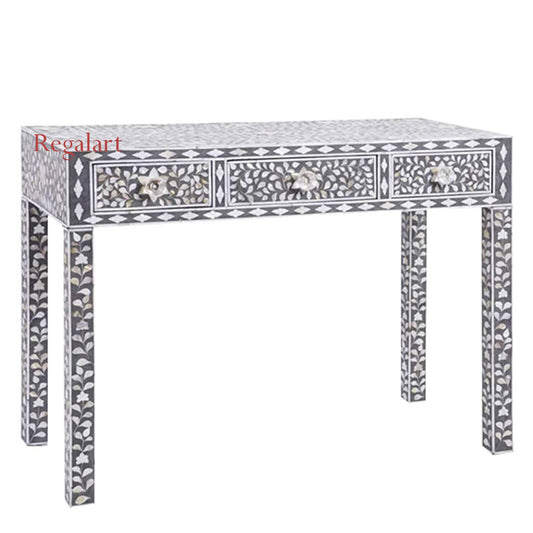 Mother of Pearl Console Table in Dark Grey | Handmade Study Desk | Elegant Bone Inlay Desk for Home Office Décor