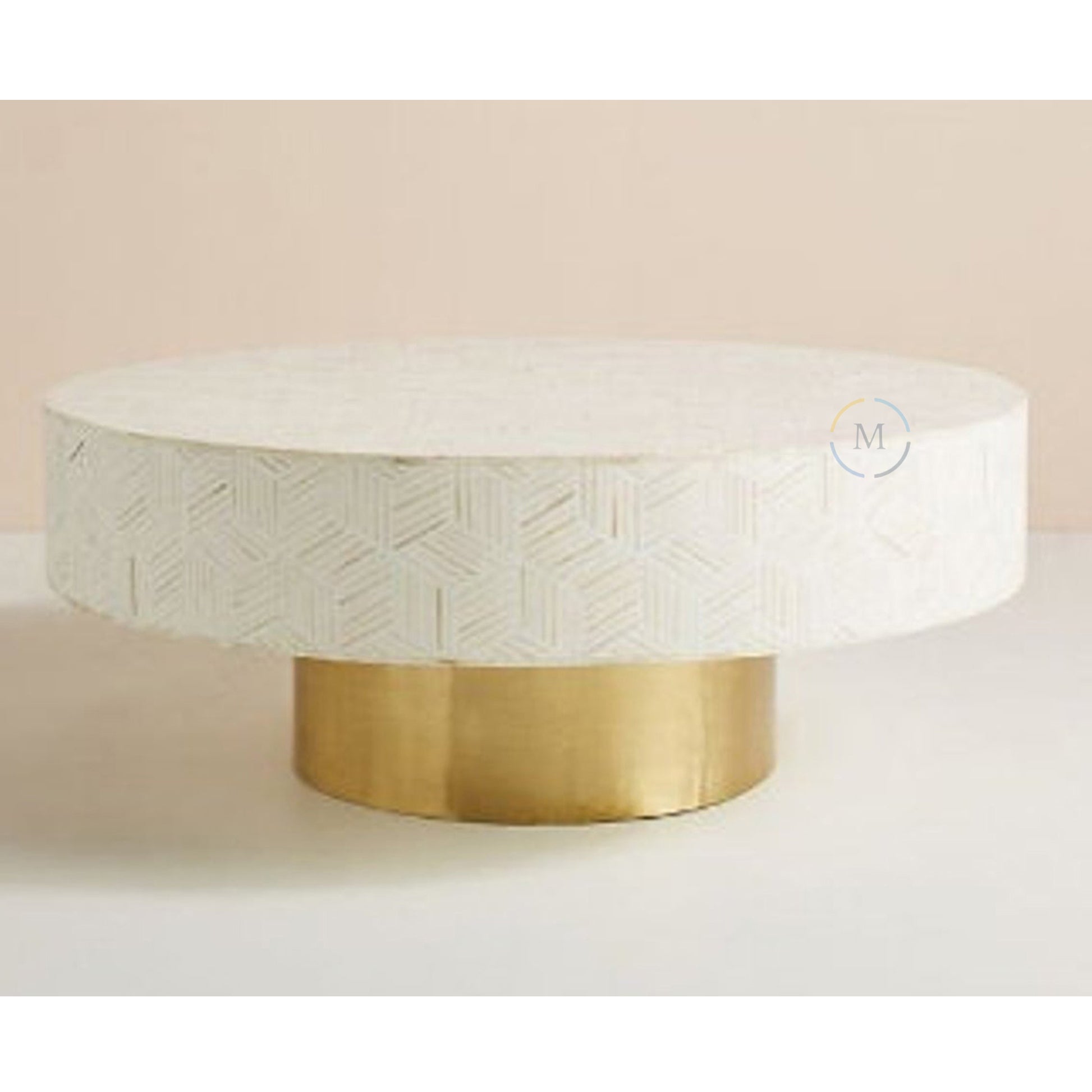This luxurious round coffee table features a unique bone inlay pattern, meticulously handcrafted by artisans from The Regal Art.